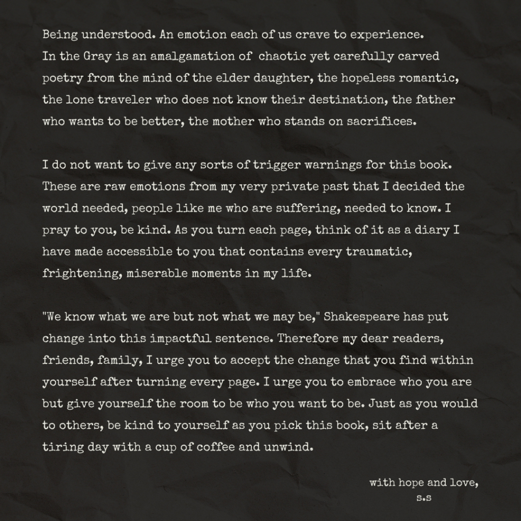 In the Gray is an intimate collection of chaotic yet carefully carved poetry from the mind of the only child, the elder daughter, the hope (ful / less) romantic, the lone traveler unaware of their destination, the father who wants to be better, the mother who stands on an ocean of sacrifices. An amalgamation of raw emotions from the author’s past, this riveting read is a personal diary presented to the world.